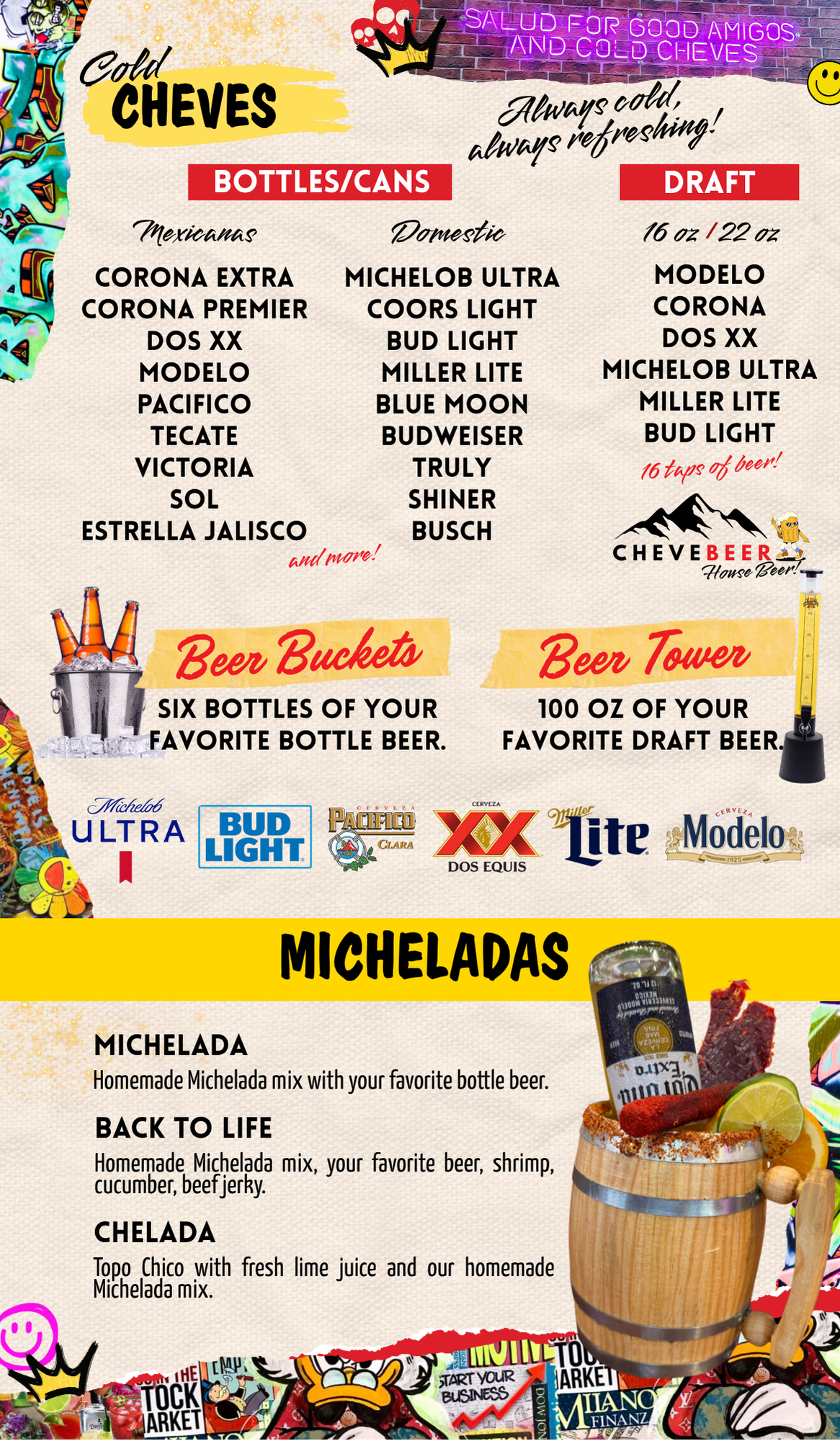 Our signature michelada — loaded Our signature Michelada Cheveland is where flavor meets fiesta — a bold blend of Mexican beer, tangy lime, savory sauces, and our house-made spice mix. Garnished with shrimp, tamarindo, and a Tajín rim, every sip delivers the perfect mix of heat, refreshment, and attitude. Crafted to perfection and made for good times, it’s more than a drink — it’s the Cheveland experience in a cup.with flavor, spice, and attitude. Served with shrimp, tamarindo, and a cold Corona for the ultimate fiesta in a mug.