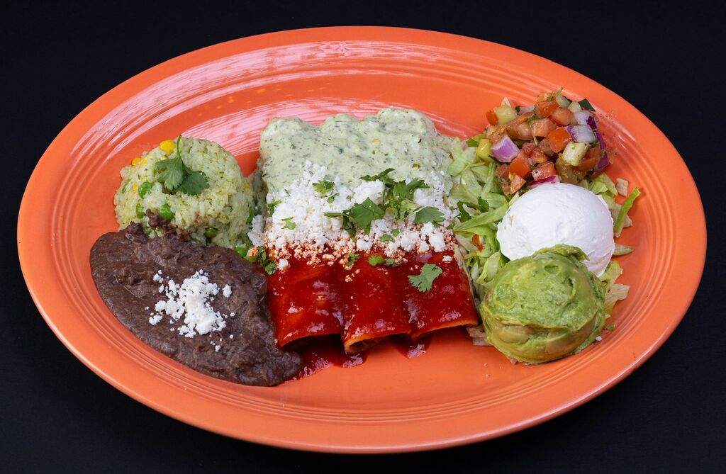 A classic Mexican favorite made with soft corn tortillas filled with savory chicken, smothered in rich red sauce, and topped with melted cheese, crema, and fresh cilantro. Each bite delivers comfort, warmth, and authentic homemade flavor — best enjoyed with a cold cerveza and good company.